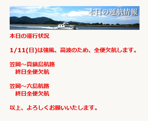 2026年1月11日 笠岡諸島への船便欠航のお知らせ 【三洋汽船...