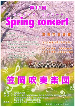 第11回 スプリングコンサート 笠岡吹奏楽団がお届けする、春の音楽会。 笠岡東・笠岡西・金浦中学校吹奏楽部との合同演奏! 「スタジオジブリ作品集」など、心弾むプログラムをお届けします♪ 春のひとときに吹奏楽のあたたかいサウンドをぜひお楽しみください。 ご家族・お友達と一緒にぜひお越しください! ≪開催概要≫ 日にち:2026年3月15日(日) 場 所:笠岡市民会館 時 間:13:30開場/14:00開演 入場料:500円(中学生以下無料)