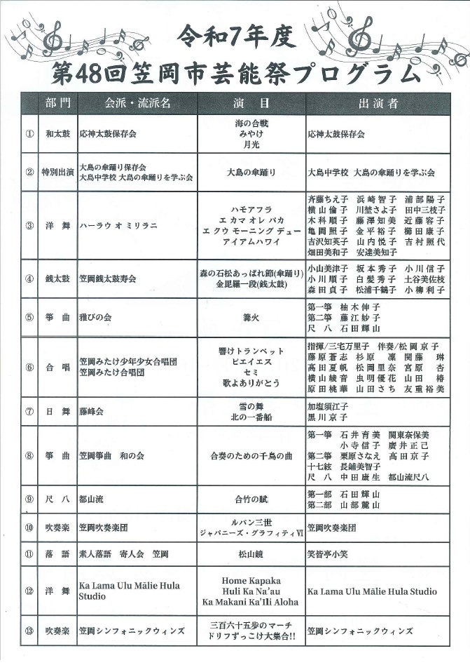 日舞、尺八、箏曲、銭太鼓、和太鼓、合唱、吹奏楽、洋舞、落語