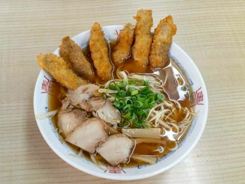 笠岡沖で獲れたシャコのフライが贅沢にのるラーメンは、衣に染み出したスープが深いコクを生む唯一無二の味わい。