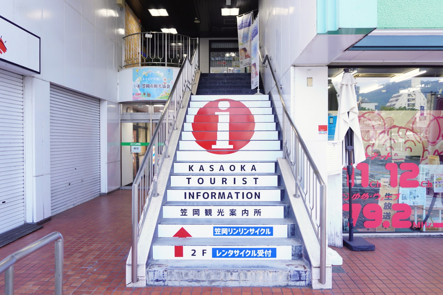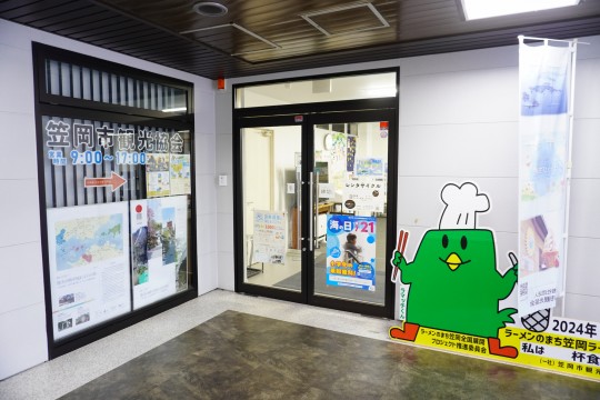笠岡駅を出て西へすぐ、白い3階建てビルの2階が観光協会です。
