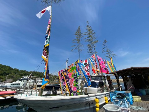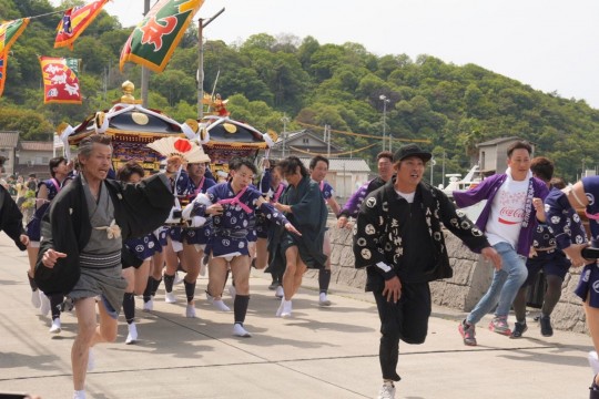 大漁旗で飾られた漁船で海を渡り、本浦地区へ上陸した神輿が、猛スピードで通りを駆け抜ける姿は迫力満点です!